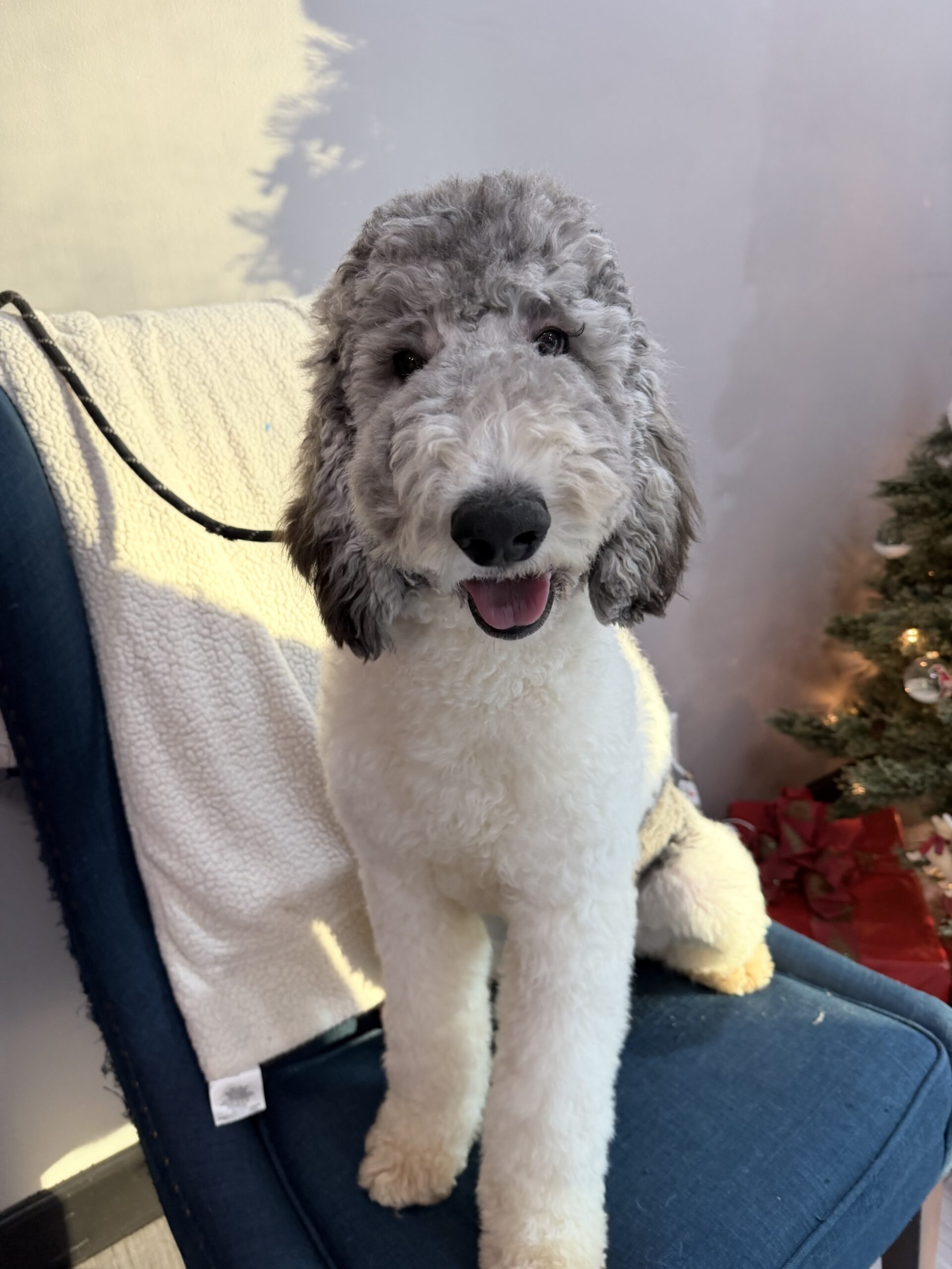 This beautiful tri-color (black/white/brown) Moyen Poodle will weigh approximately 30–35 lbs full grown – the perfect medium size for an active family, therapy work, or service training.