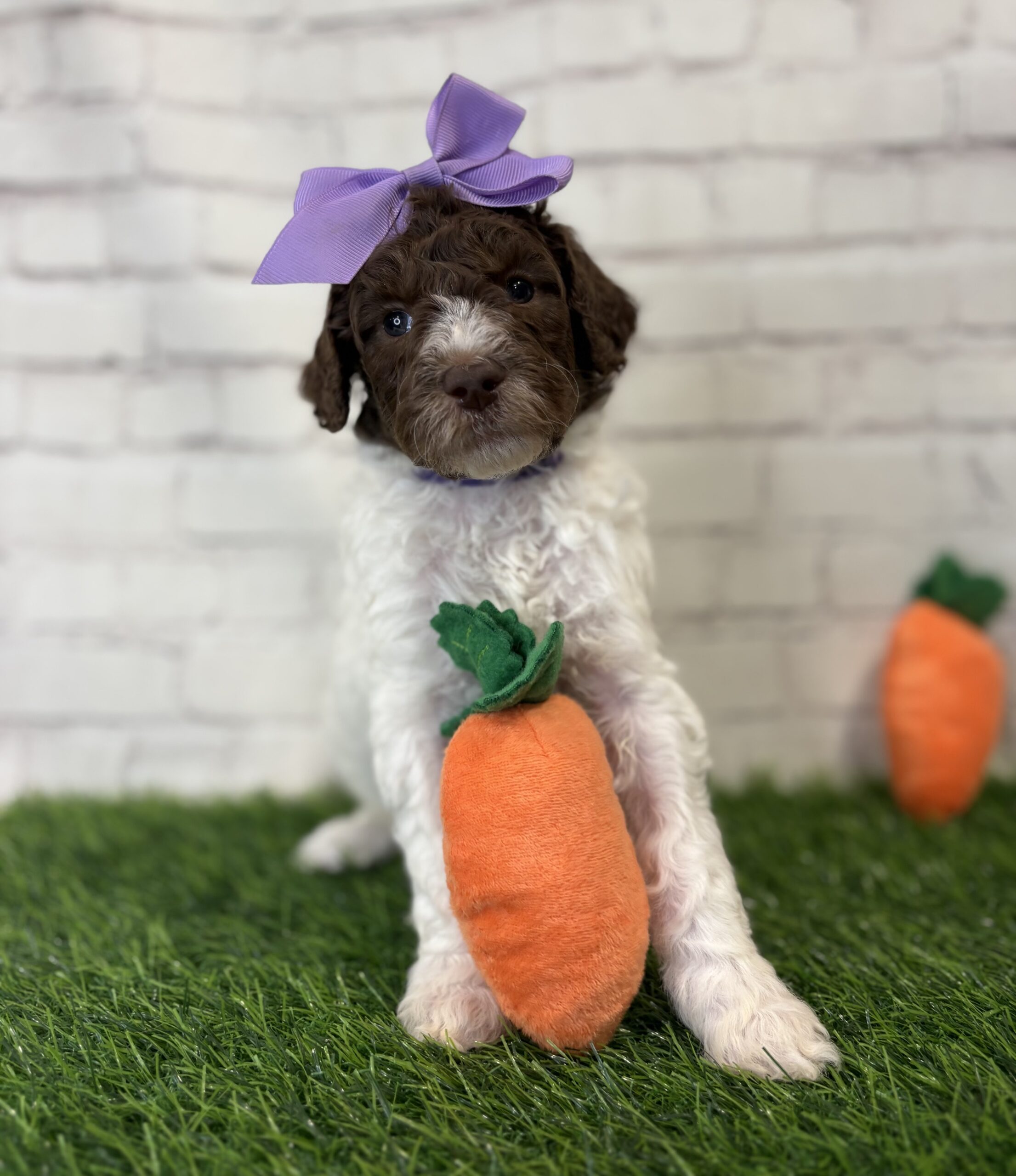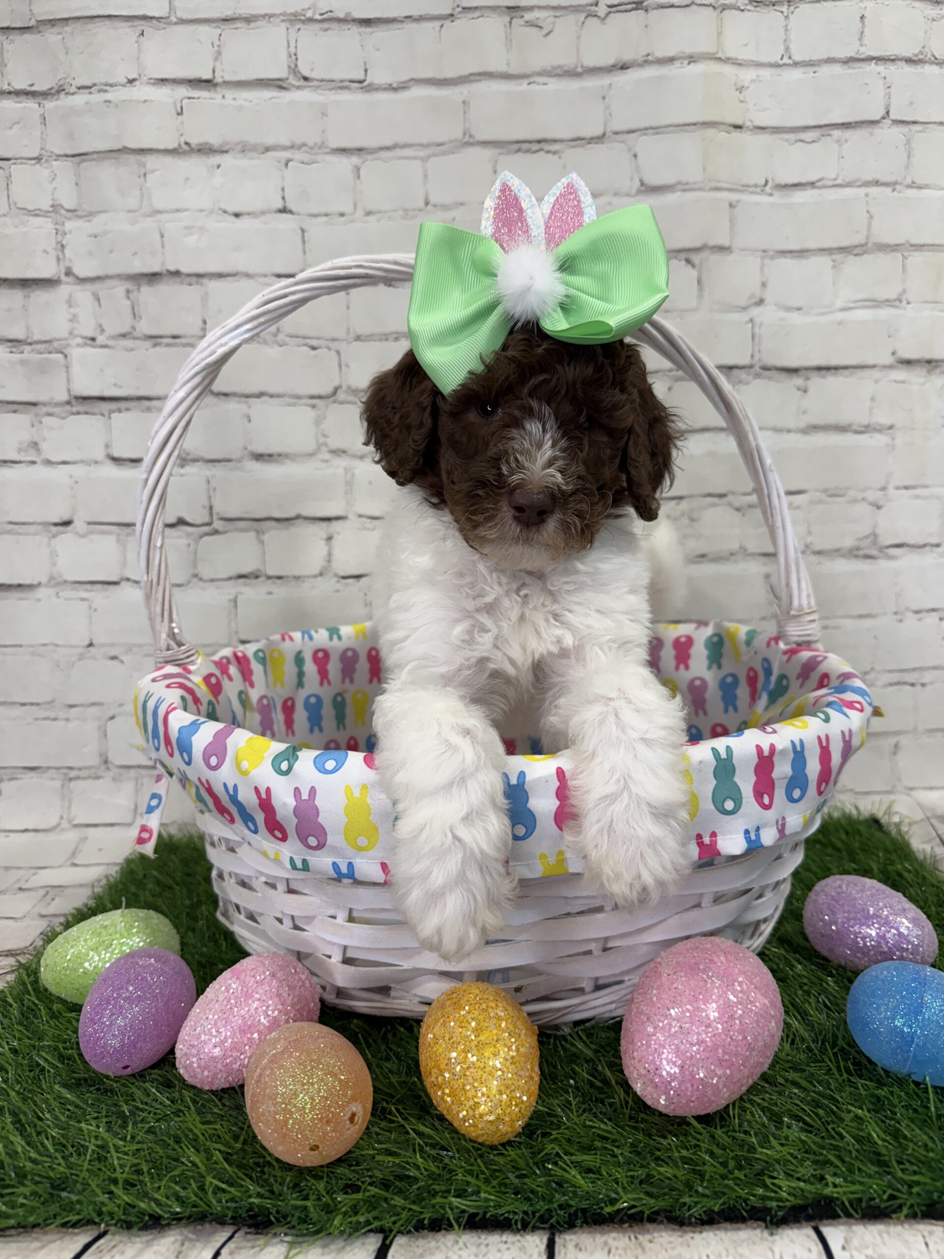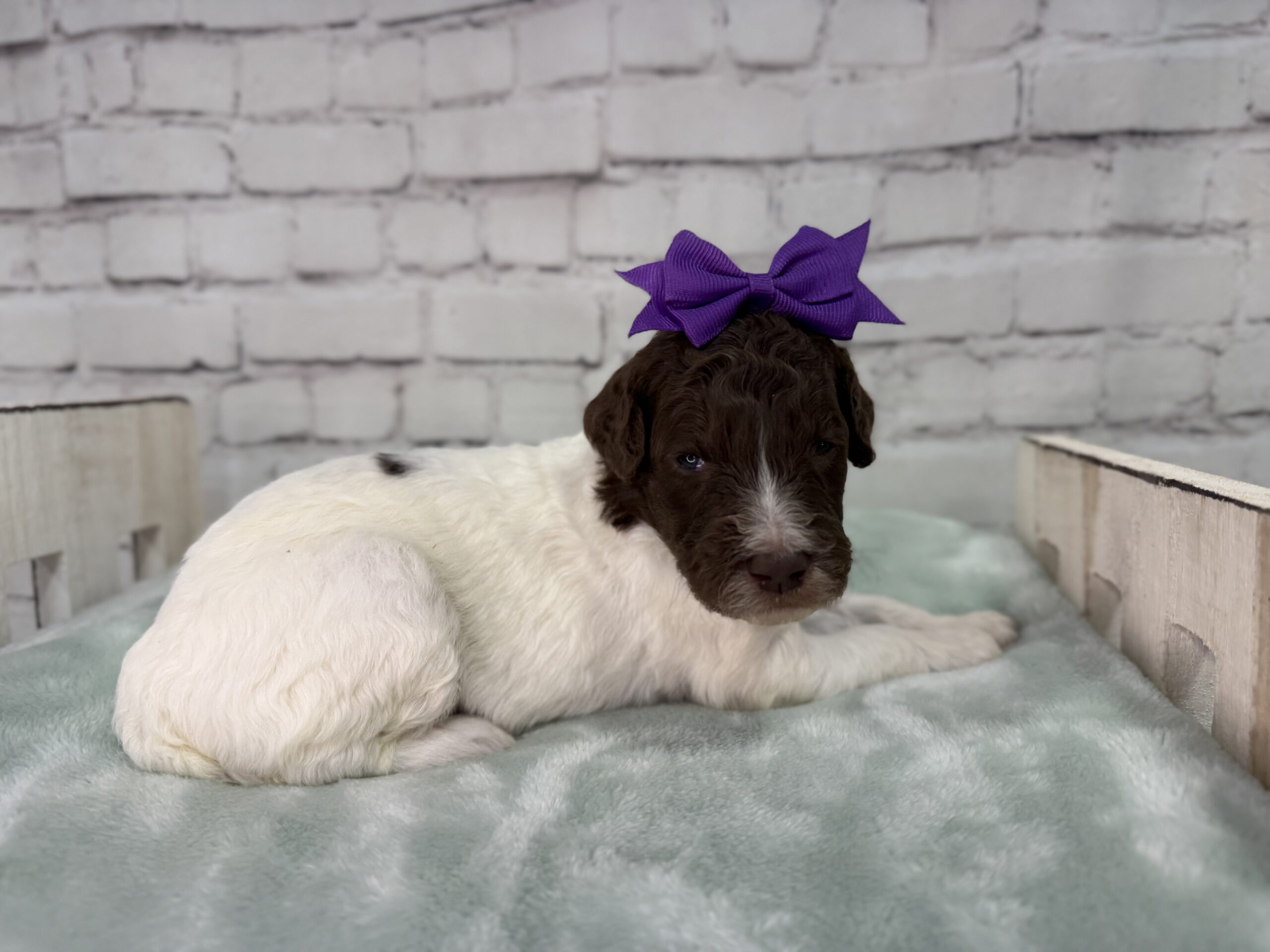Oakley is a gorgeous chocolate parti with a steady, affectionate temperament and a confident, people-loving personality. She brings strong structure, intelligence, and a beautiful curly coat to this litter. Oakley is genetically clear through Embark and represents the consistency you’ve come to expect from your established Shepadoodle program.