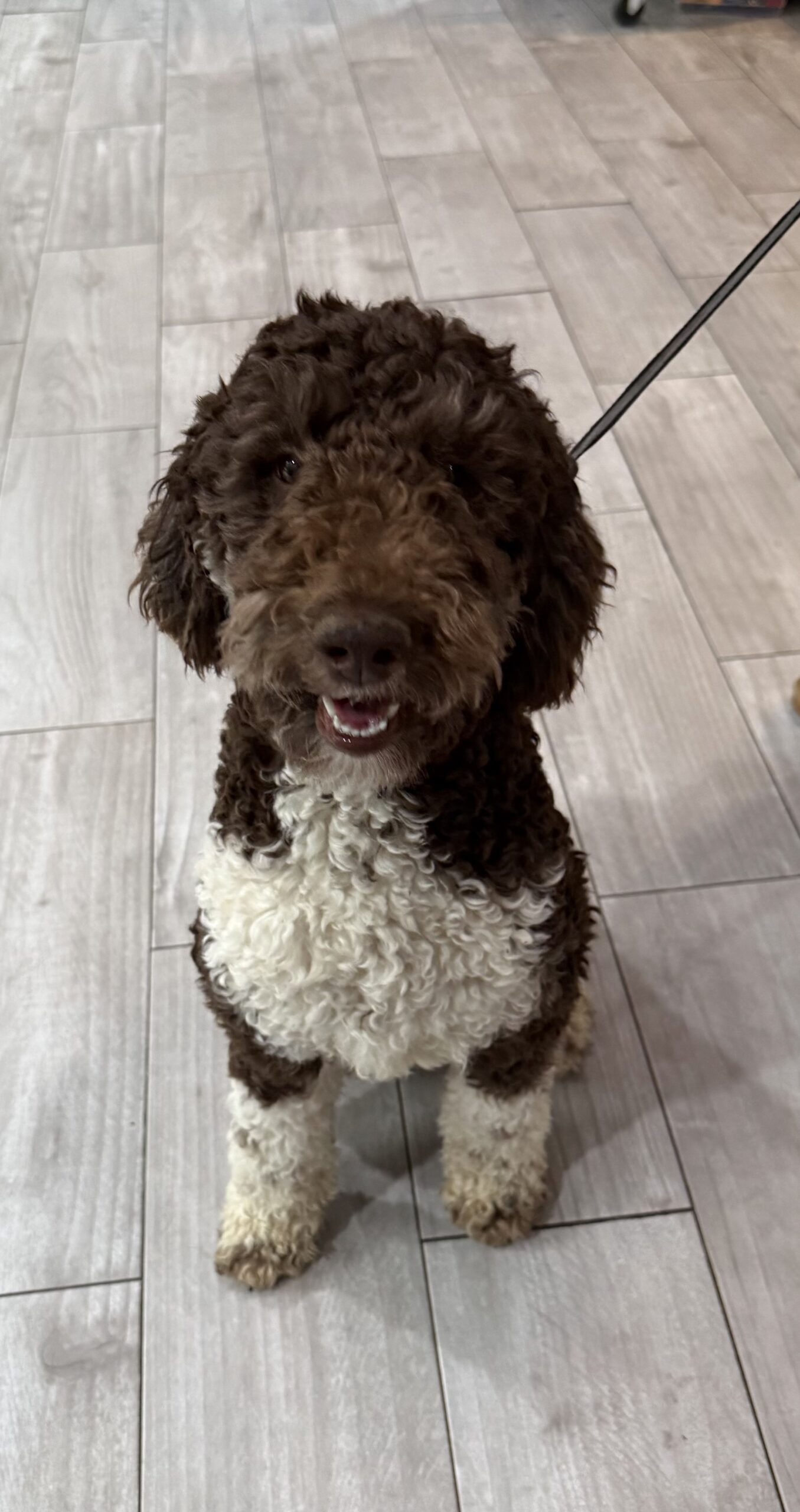 Meet Mia! She is a stunning Chocolate Phantom Parti Moyen Poodle will weigh approximately 40 lbs full grown – the perfect medium size for an active family, therapy work, or service training.