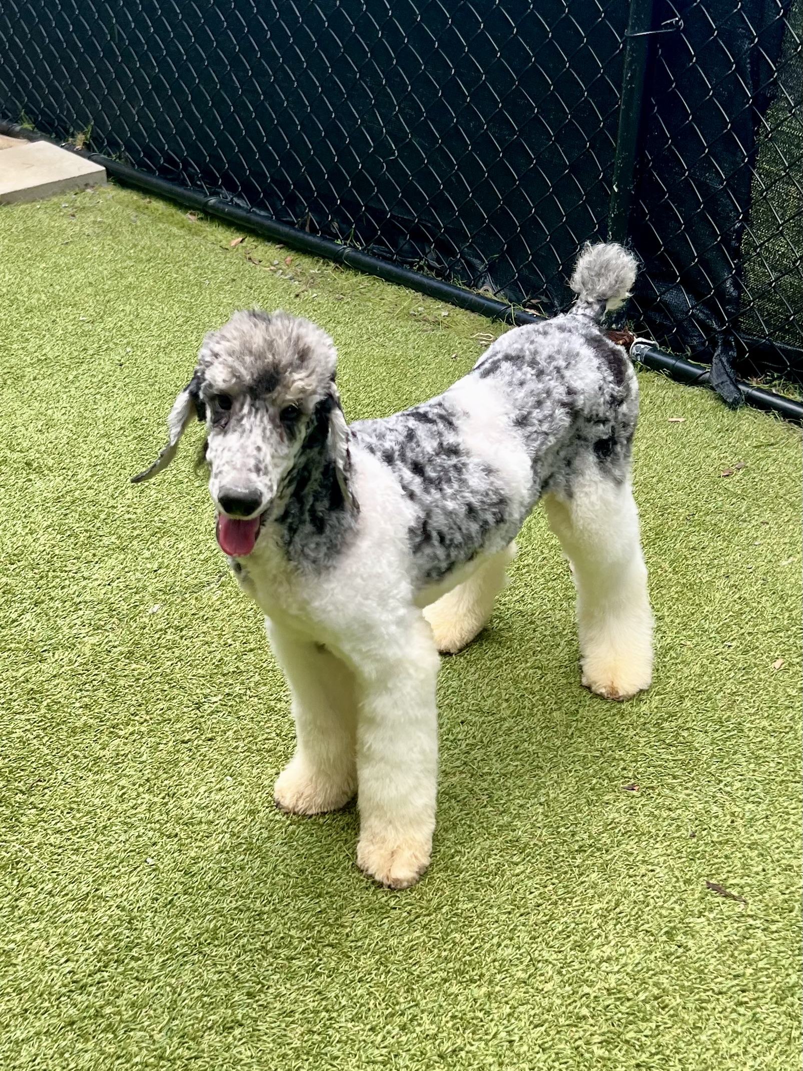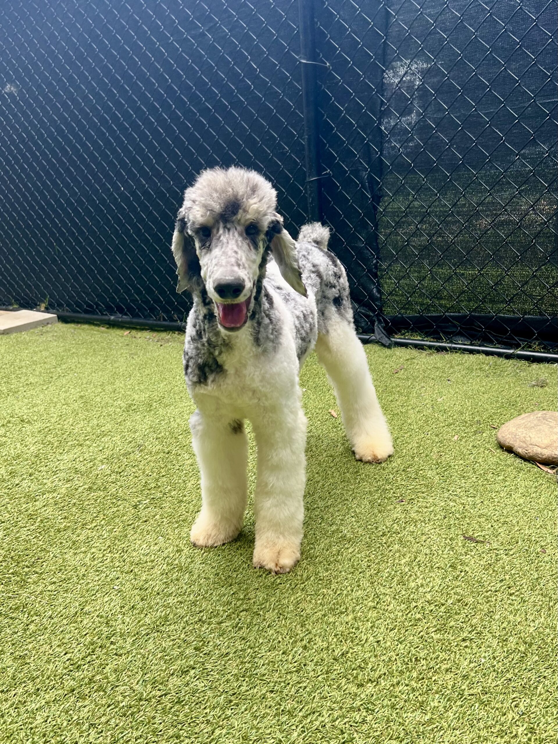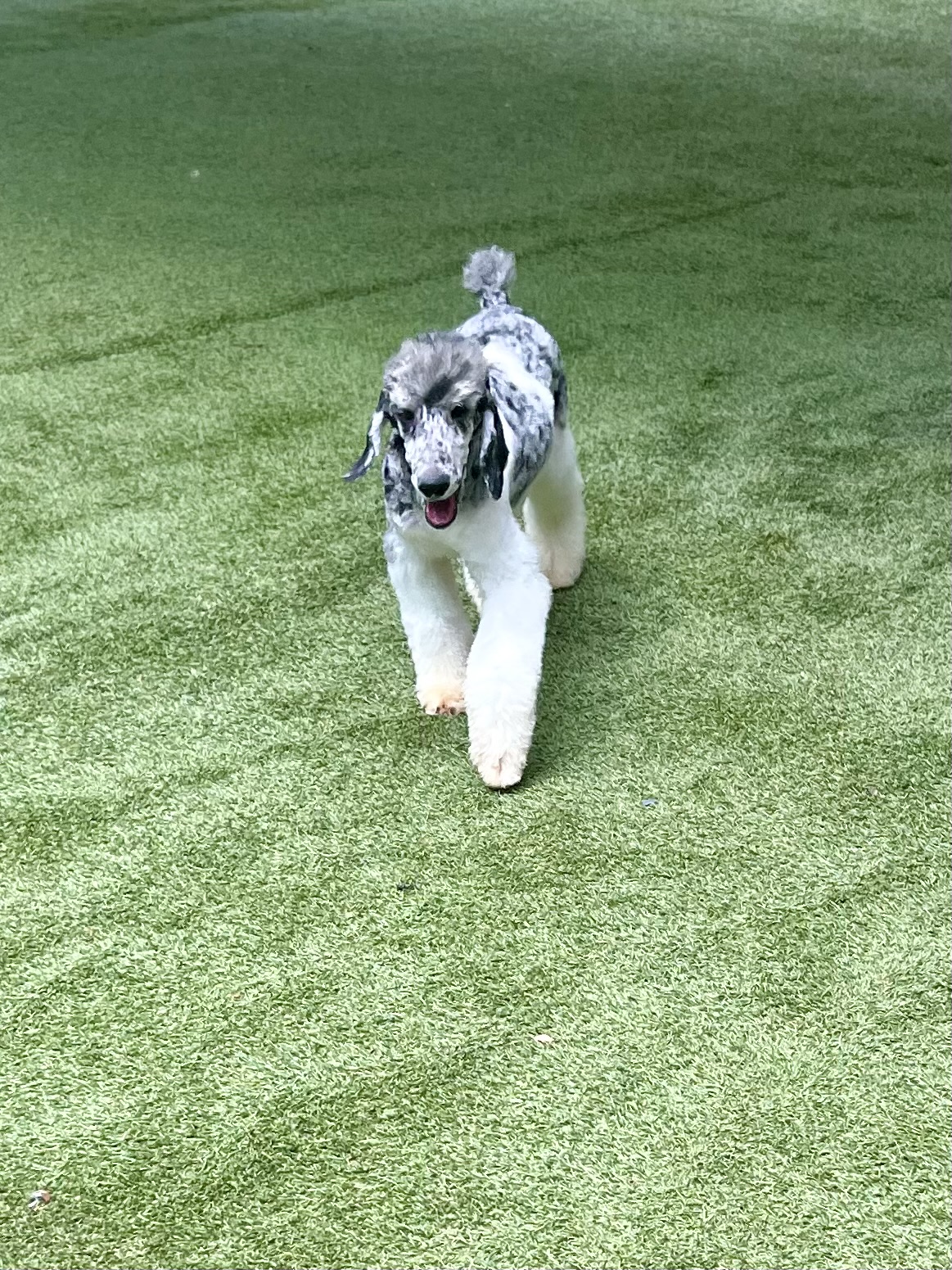 This stunning blue merle Moyen Poodle will weigh approximately 30–35 lbs full grown – the perfect medium size for an active family, therapy work, or service training.