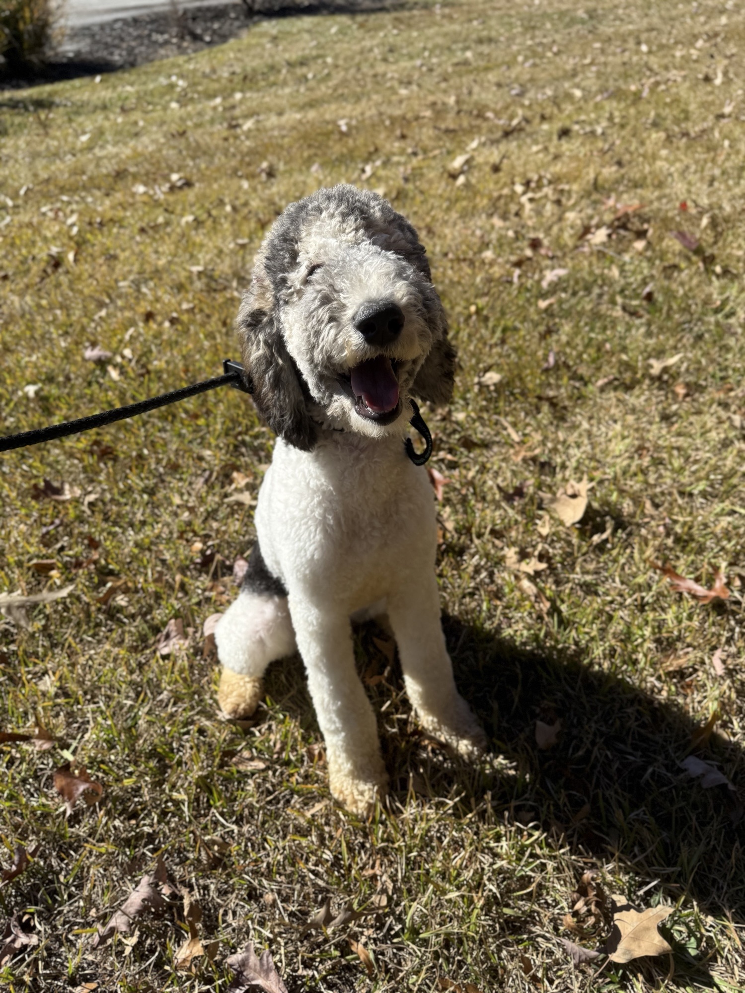 This beautiful tri-color Moyen Poodle will weigh approximately 30–35 lbs full grown – the perfect medium size for an active family, therapy work, or service training.